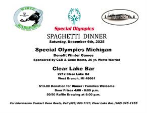 For information, contact Gene Reetz at 586-980-1107 or Clear Lake Bar at 989-345-1155